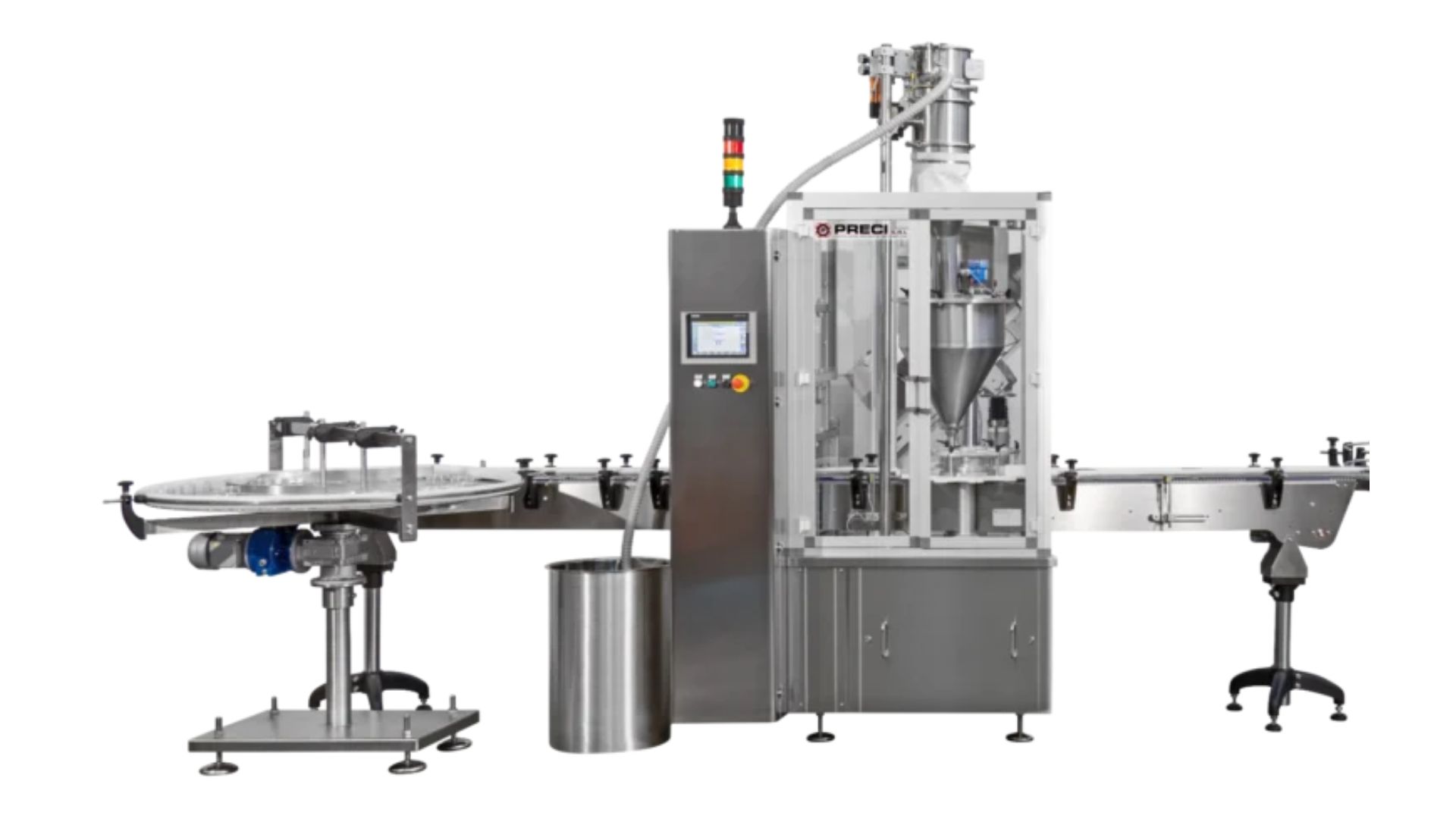 ATOLLO is an automatic powder and granule filling machine designed for high-precision filling of rigid containers in the food industry.