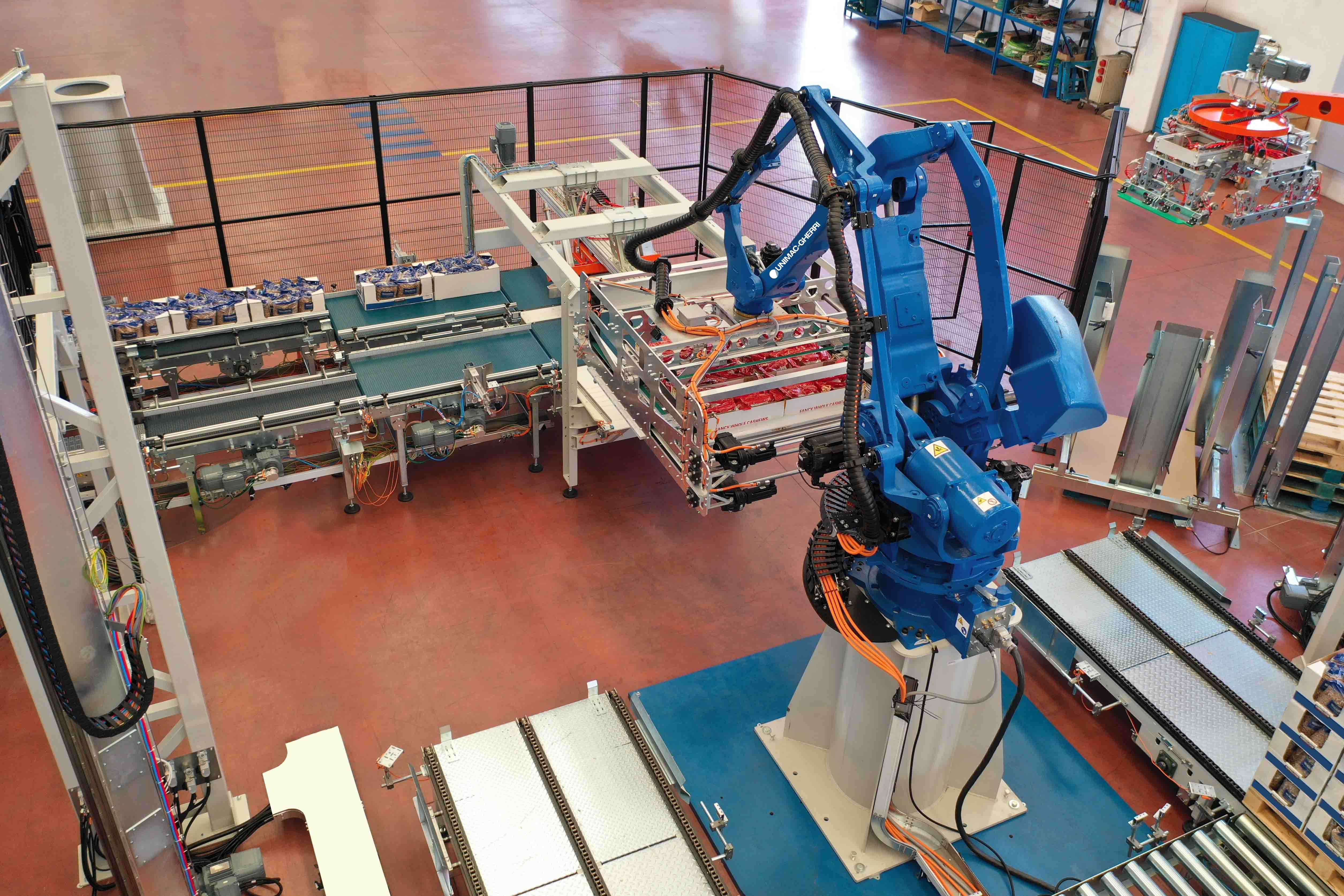 Paletizadores y despaletizadores robóticos para frascos, botellas y latas llenas con cabezales magnéticos.