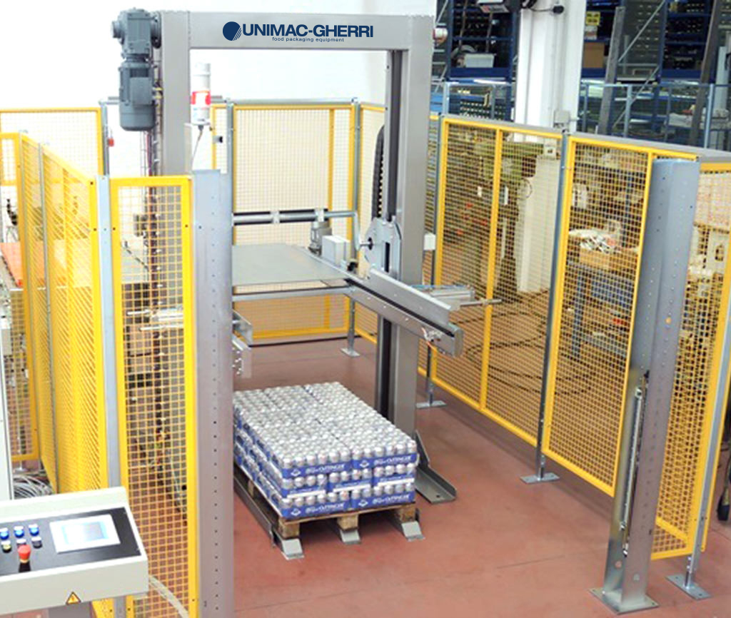 Palettiseur à tête magnétique avec l’entrée à bas niveau et la structure à double colonne.